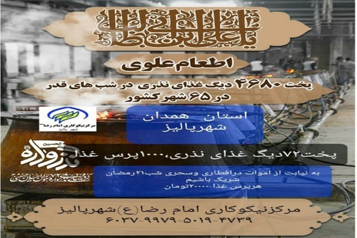 وی افزود: همزمان با پخت چهار هزار و 680 دیگ غذای نذری در شبهای قدر در ۶۵ شهر کشور، ۷۲ دیگ غذای نذری در اسدآباد برپا شده و 10 هزار پرس غذا در بین نیازمندان توزیع میشود.